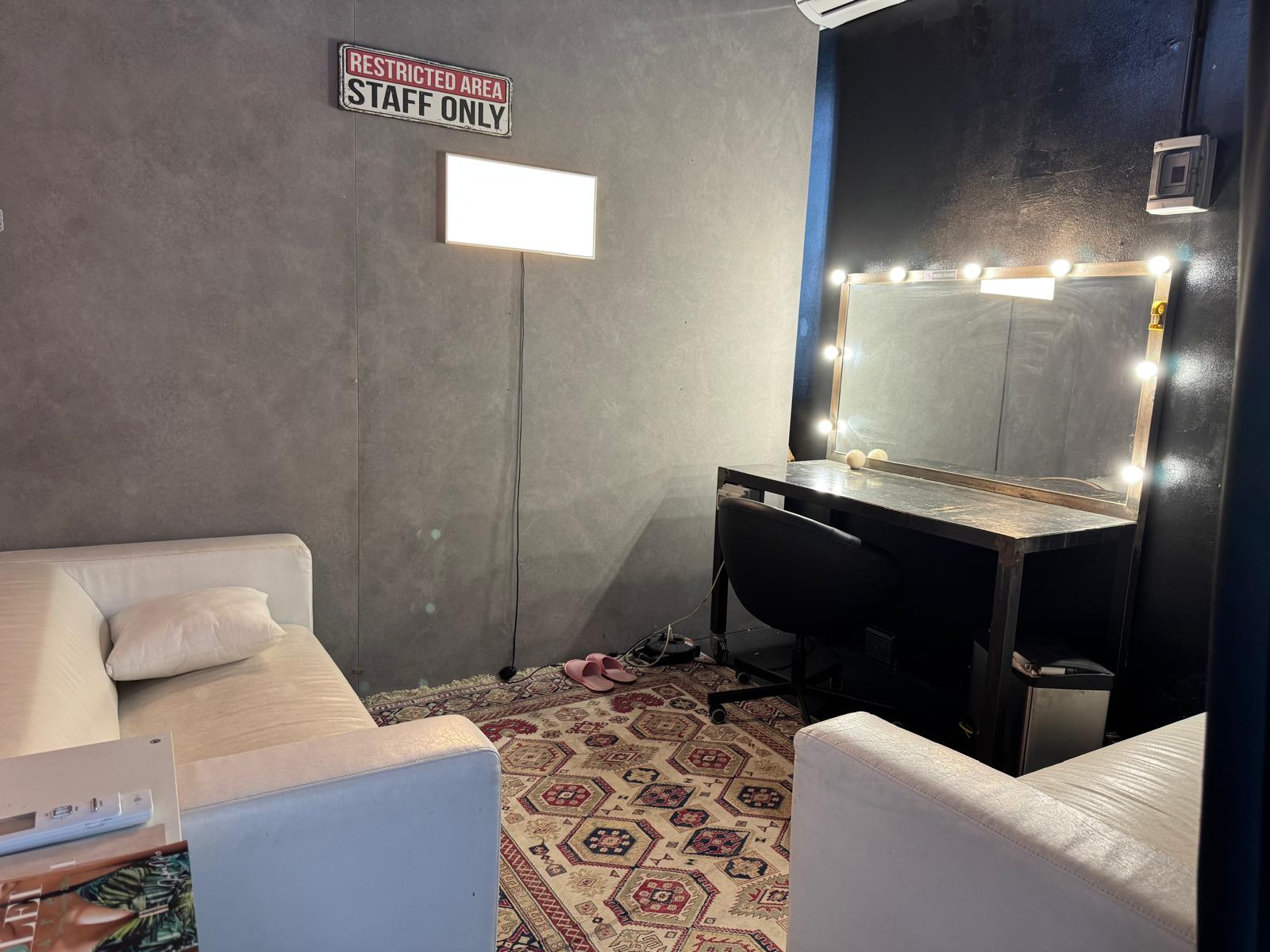 Il nostro elegante makeup booth, dotato di specchio LED e illuminazione neutra, offre ai vostri hairstylist e makeup artist tutto il necessario per lavorare in comfort e precisione.